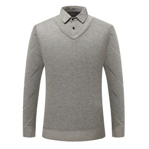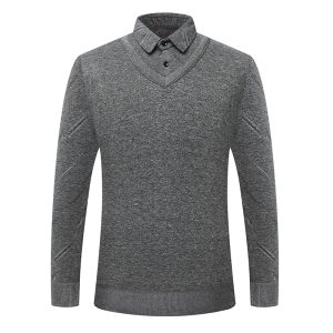 Men’s Solid Thicker Long-Sleeved Fit V Neck Lapel Fake 2-Piece Pullover Sweater