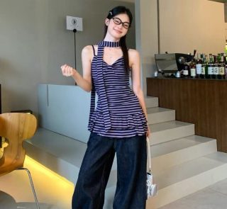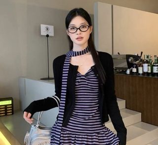 古早条纹辣妹设计感蝴蝶结吊带+长袖开衫套装(配飘带)