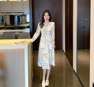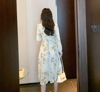 Эмэгтэйчүүдийн хавар намрын цэцэгсийн хээтэй урт ханцуйтай даашинз
