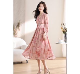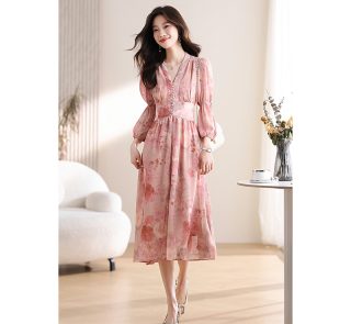 Эмэгтэйчүүдийн хавар намрын цэцэгсийн хээтэй урт ханцуйтай даашинз