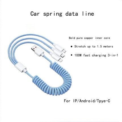 Retractable 3-in-1 PD100W Fast Charging Nylon Braided Cable,150cm Self-Coiling Cord,Triple Ports (Lightning/Type-C/Micro) Simultaneous Charge
