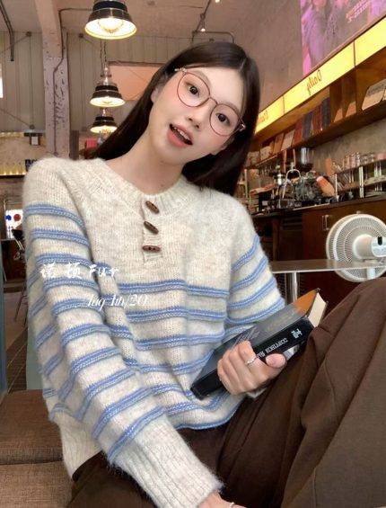 羊驼绒牛角扣条纹圆领宽松慵懒风软糯针织衫 $45.00 Original price was: $45.00.$33.00Current price is: $33.00.件