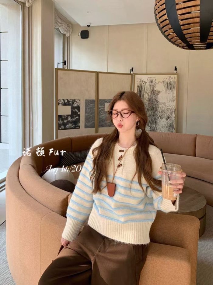 Home clothing&fashion baby's clothing tops 羊驼绒牛角扣条纹圆领宽松慵懒风软糯针织衫