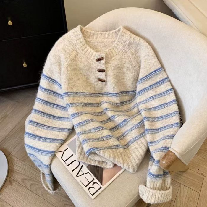 羊驼绒牛角扣条纹圆领宽松慵懒风软糯针织衫 - mongoyia