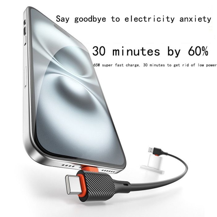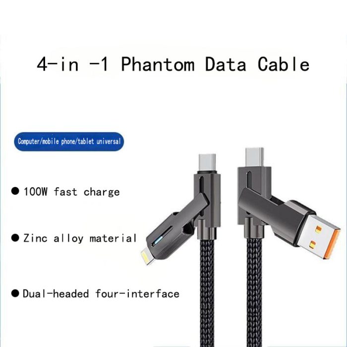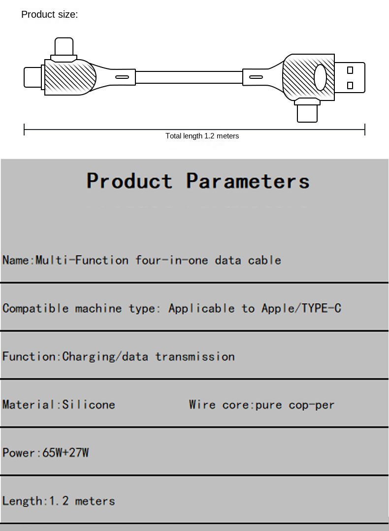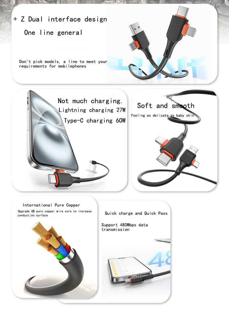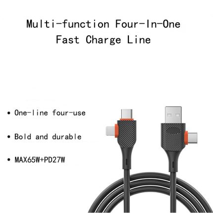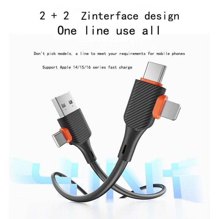 65W Silicone Cable 2-in-2, 4-Port Charging Cable,120cm Skin-Friendly Silicone,USB/Lightning/Dual Type-C Multi-Device Fast Charge